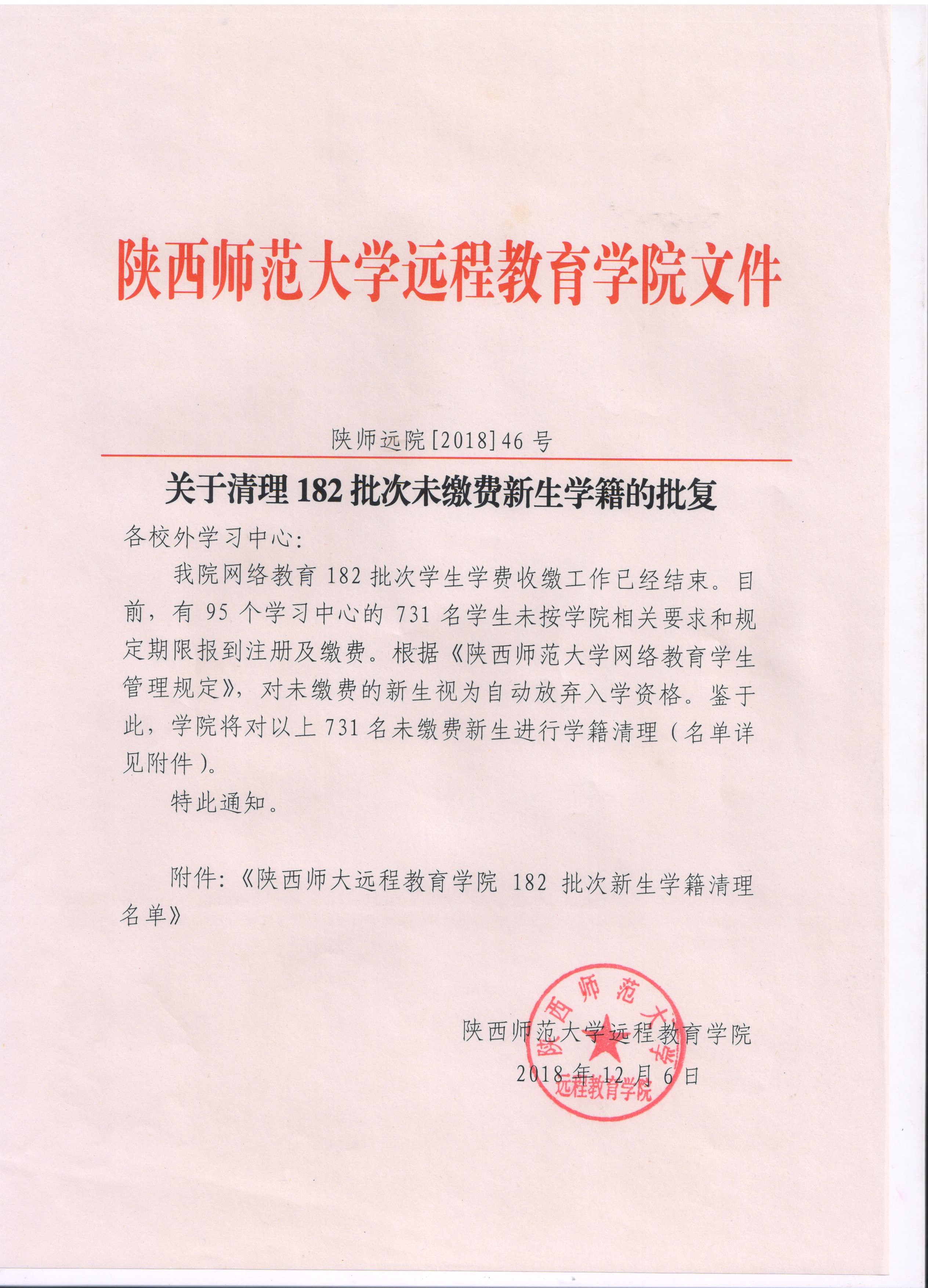关于清理182批次未缴费新生学籍的批复