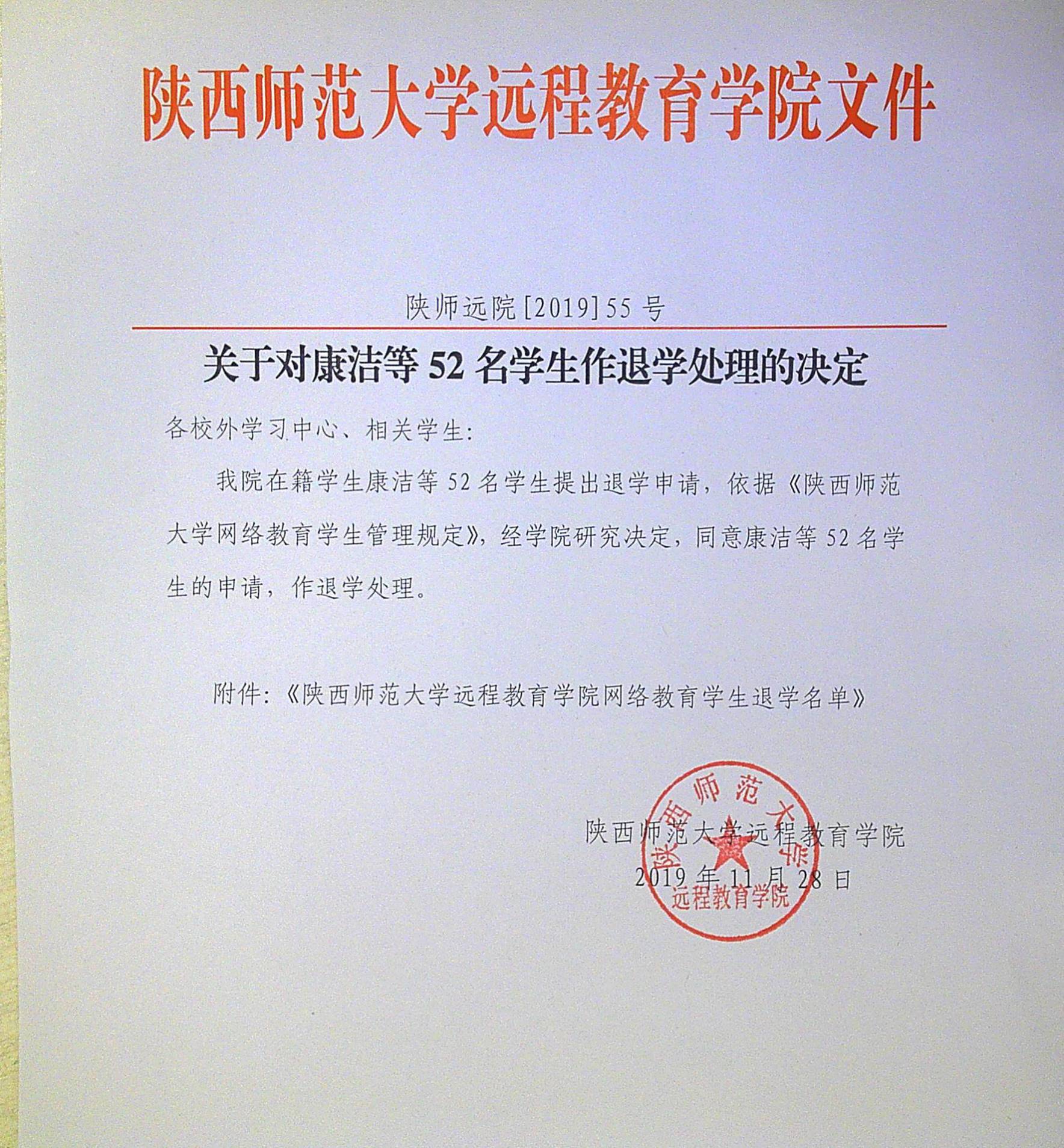 关于对康洁等52名学生作退学处理的决定