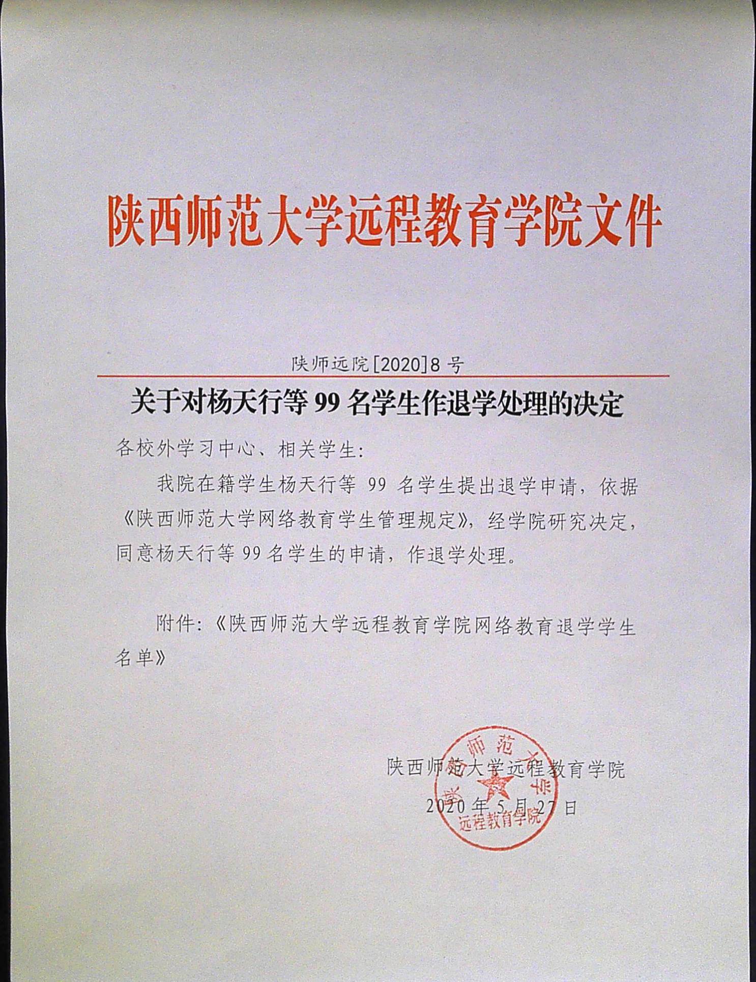 关于对杨天行等99名学生作退学处理的决定