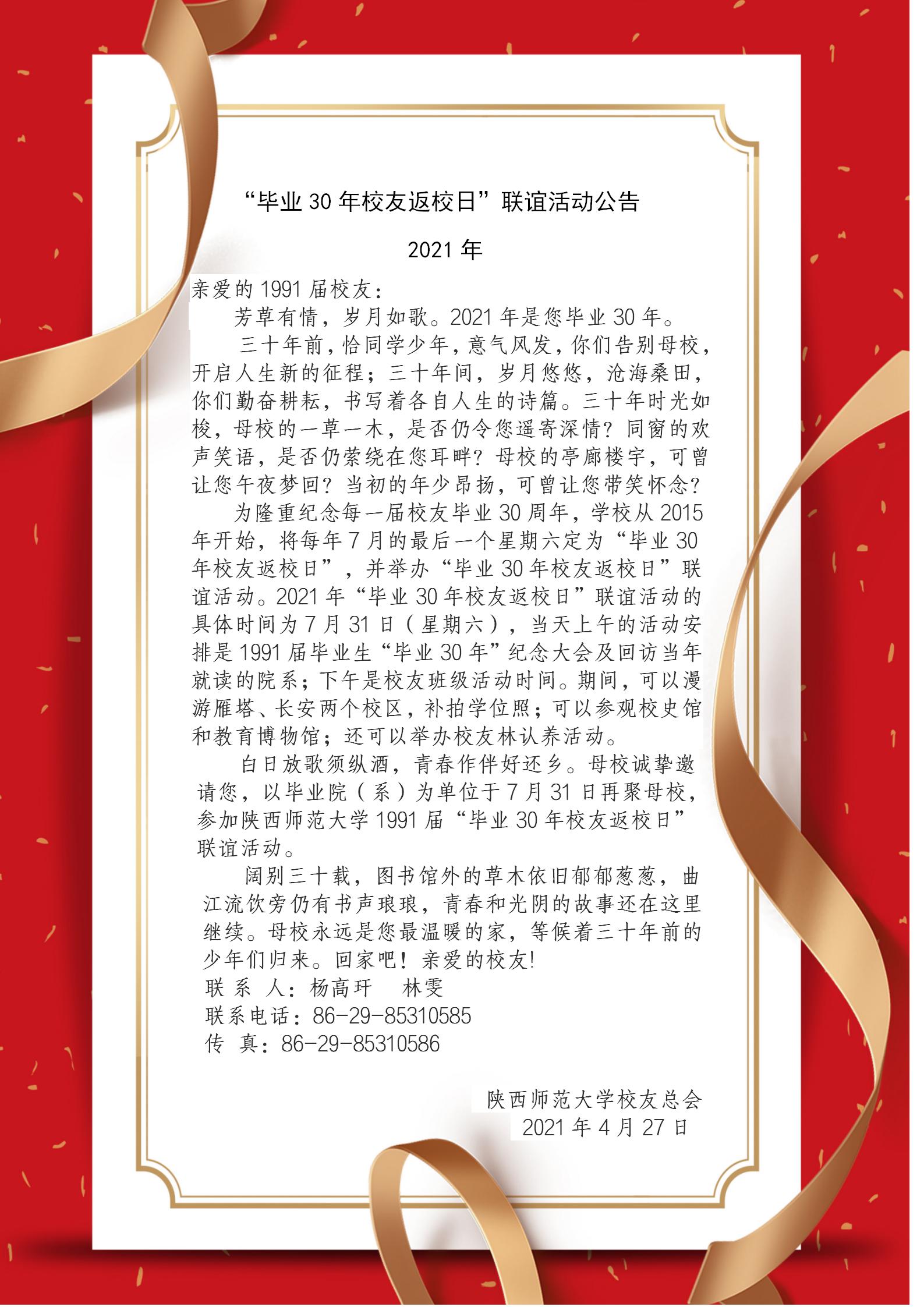 附件:陕西师范大学关于举办2021年“毕业30年校友返校日”联谊活动的公告