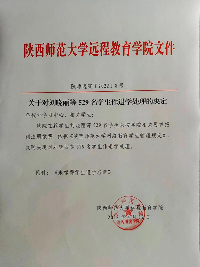 关于对刘晓丽等529名学生作退学处理的决定
