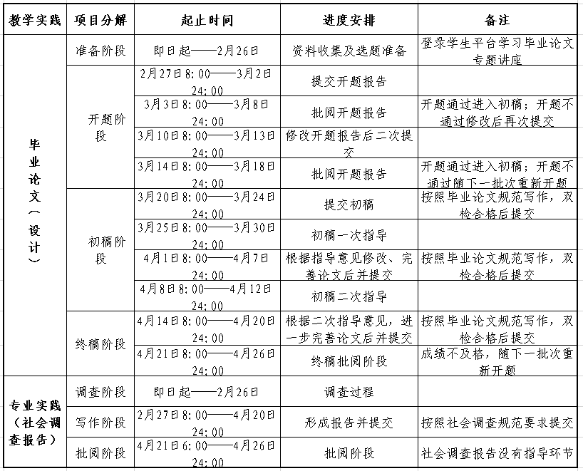 一、写作对象 高起本、专升本:2024级及以前教学实践(毕业论文或专业实践)未通过学生,学生信息见附件1 二、写作内容 1.毕业论文(设计) 2.专业实践(社会调查报告) 三、时间安排 四、操作路径 1.学生端: 2023级及以前学生http://netstu.snnu.net/Login.aspx 2024级学生 http://pxgl.snnu.net 登陆平台后,进入【教学实践】—【我的论文(我的社调)】,认真阅读上传须知,按阶段提交相应稿件。 2.教学点端:登录教务管理平台,查看应提交学生名单及各阶段稿件提交情况。 五、注意事项 1.写作要求 (1)毕业论文(设计)选题须符合本专业范围,结合实际工作自拟题目,不得跨专业选题; (2)选题应具体明确,避免过于宽泛或过深; (3)开题报告通过后进入初稿阶段。 2.检测要求 根据教育部《本科毕业论文(设计)抽检办法(试行)的通知要求》,学生提交终稿前需对毕业论文格式及内容进行检测: (1)格式检测:严格依据《教学实践格式及规范》(附件2)对论文结构、排版和格式进行自查;